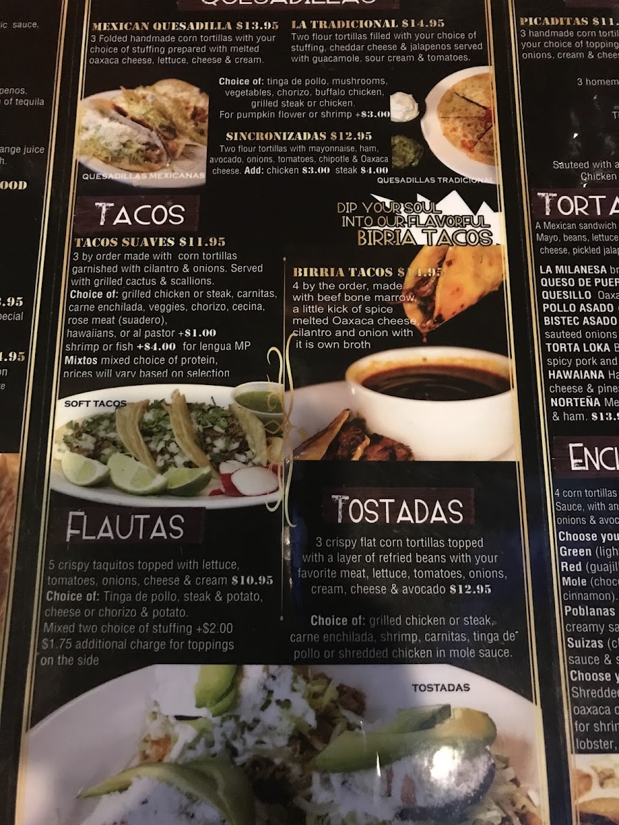 4 corn tortillas smothered in Mole (Chocolate, Dried Peppers, Plantains & Cinnamon) sauce with your choice of stuffing, onions, crema, Cotija cheese, & avocado.